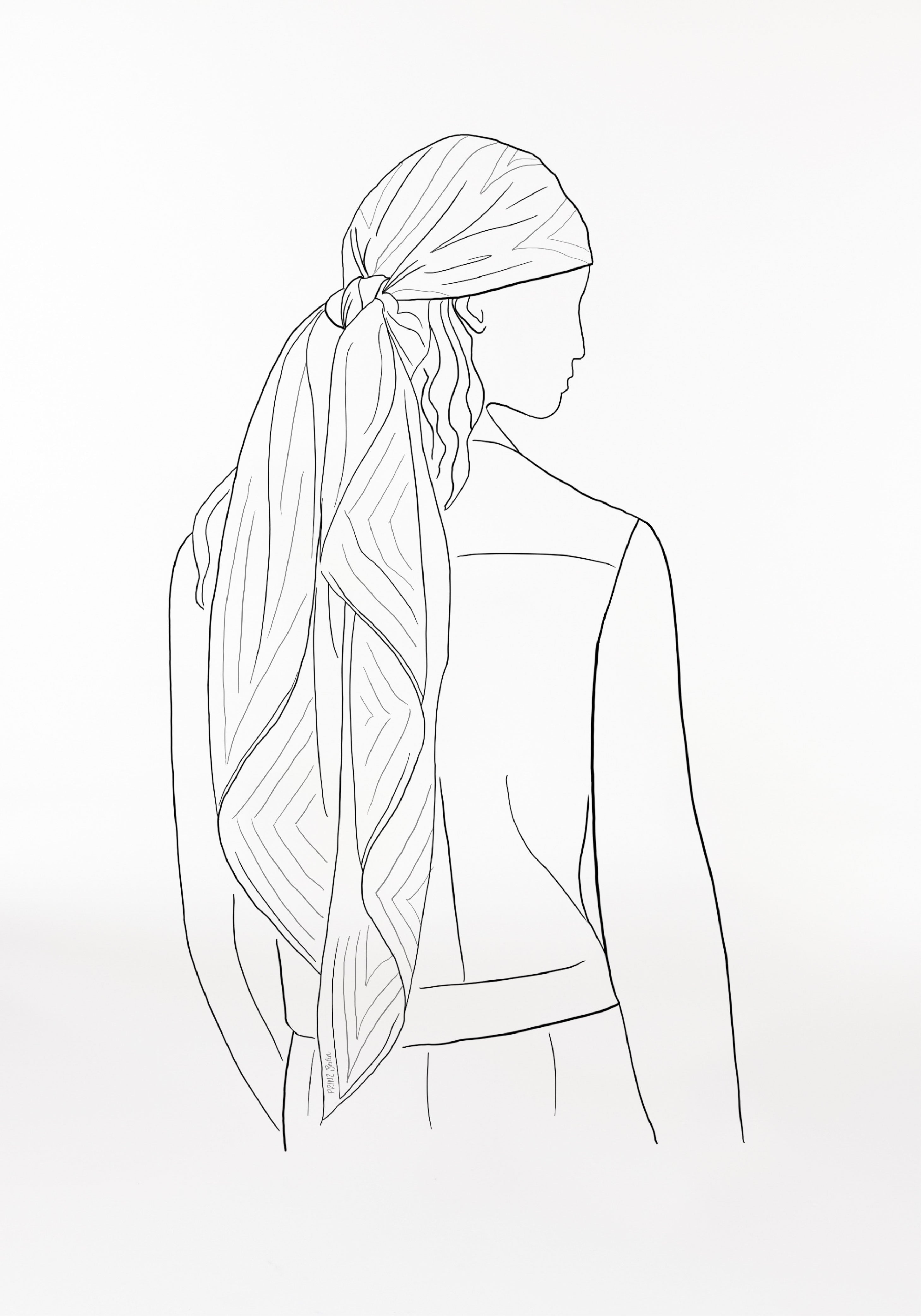 - Place the folded scarf over your head so that the wide side of the triangle falls over your forehead and the tip of the triangle points backward.