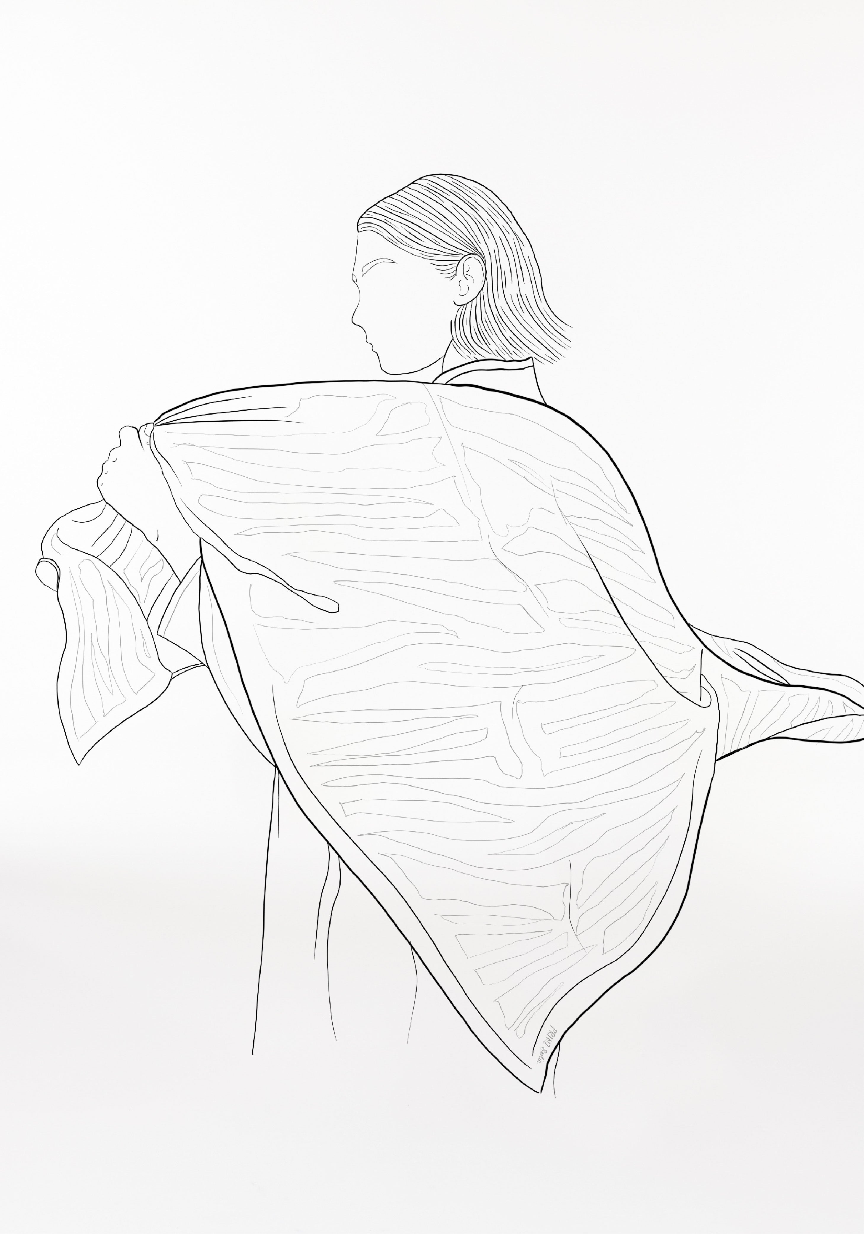 - Hold the scarf at the two top corners of the triangle and place it in front of your upper body, with the tip of the triangle pointing downwards.