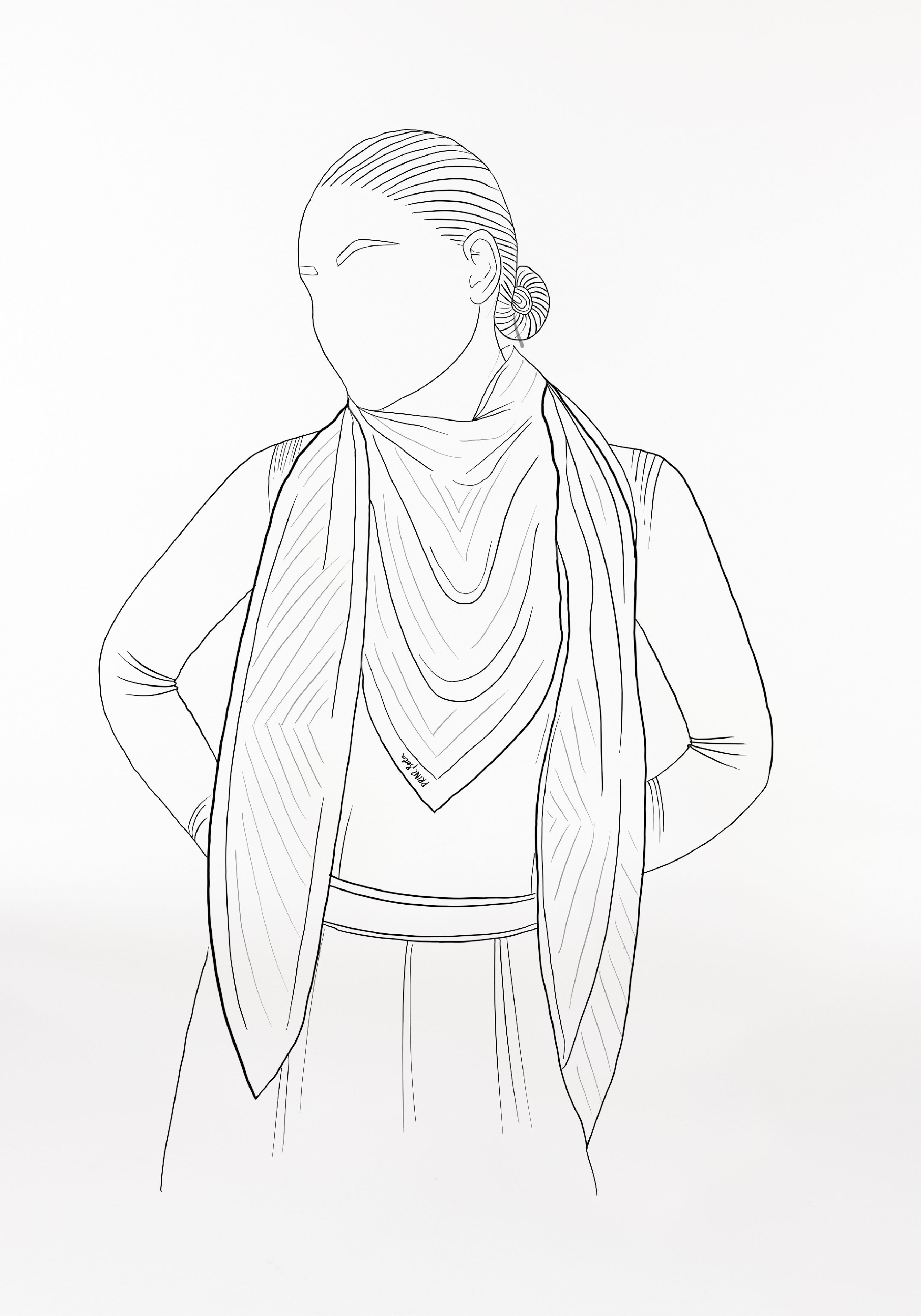 - Now, place the scarf around your neck so that both sides come forward over your shoulders.