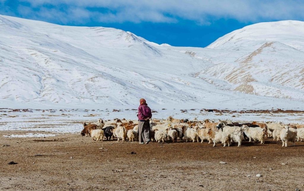 In spring, during the molting season, the valuable undercoat of the goats is combed out to separate it from the less valuable guard hair. Only about 100 grams of wool are obtained per year and per animal.